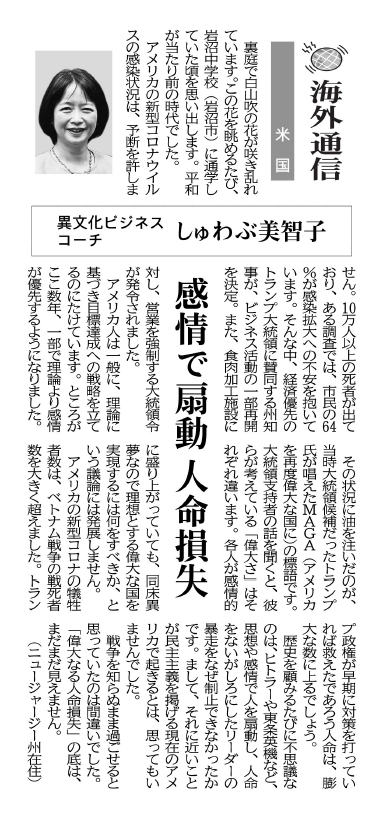 歴史を顧みるたびに不思議なのは、ヒットラーや東条英機など、思想や感情で人を扇動し、人命をないがしろにしたリーダーの暴走をなぜ制止できなかったかです。まして、それに近いことが民主主義を標榜する現在のアメリカで起きるとは、思ってもいませんでした。