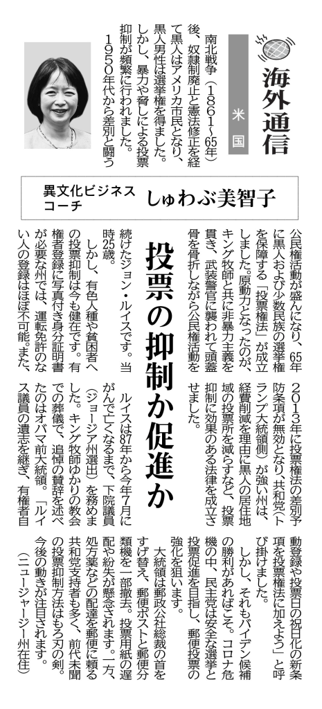 ジョン・ルイスは87年から今年7月にガンで亡くなるまで、下院議員(ジョージア州選出)を務めました。キング牧師ゆかりの教会での葬儀で、追悼の賛辞を述べたのはオバマ前大統領。「ルイス議員の遺志をつぎ、有権者自動登録や投票日の祝日化の新条項を投票権法に加えよう」と呼びかけました。