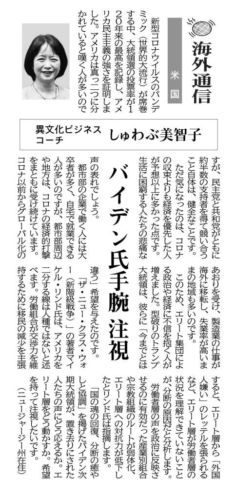 「国の魂の回復、分断の癒しと協調」をスローガンに掲げたバイデン次期大統領が、置き去りにされた人たちの声にどう応えるか。エリート層をどう動かすか。希望をもって注視したいです。