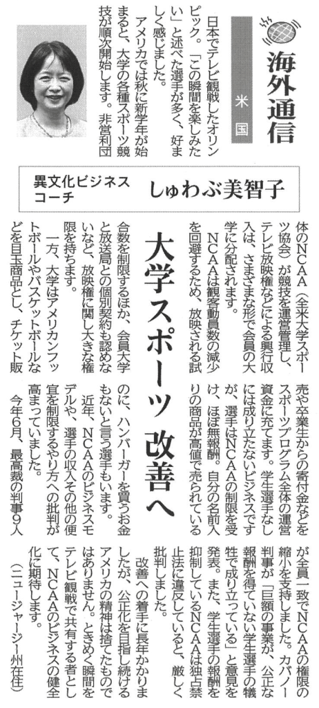 今年の6月に、最高裁の判事9人が全員一致でNCAAの権限の縮小を支持しました。カバノー判事が「巨額の事業が、公正な報酬を得ていない学生選手のお陰でなりたっている」と意見を発表。また、学生選手の報酬を抑制しているNCAAは独占禁止法に違反していると、厳しく批判しました。