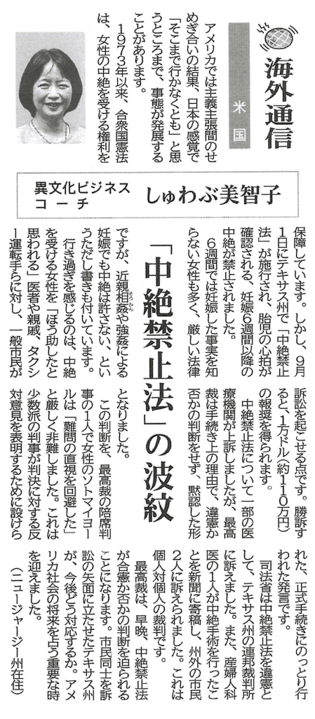 1973年以来、合衆国憲法は、女性の中絶を受ける権利を保障しています。しかし、9月1日にテキサス州で「中絶禁止法」が施行され、胎児の心拍が確認される、妊娠6週間以降の中絶が禁止されました。