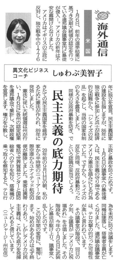 この20年間の変容に、驚愕(きょうがく)します。始めがあるものは必ず終わりあり。しかしアメリカの民主主義は、これから底力を発揮してくれると信じています。