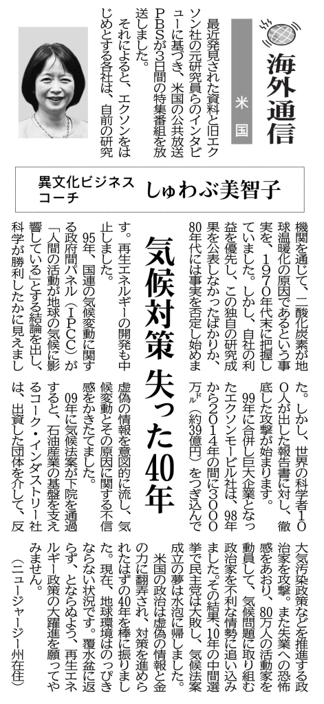 アメリカの政治は虚偽の情報と金の力に翻弄され、対策を進められたはずの40年を棒に振りました。現在、地球環境はのっぴきならない状況です。覆水盆に返らず、とならぬよう、再生エネルギー政策の大躍進を願ってやみません。