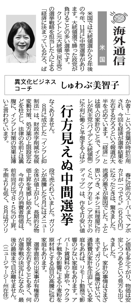 クリントン元大統領(民主党)の選挙戦略を担当した人による「経済に決まっているだろ、ばか者!」という言葉が時折引用され、今回も経済が選挙結果を左右するだろうという報道が大半を占めています。「経済」とは個人の家計のことで、インフレが民主党(バイデン大統領側)に不利に働くと予想する人は少なくありません。