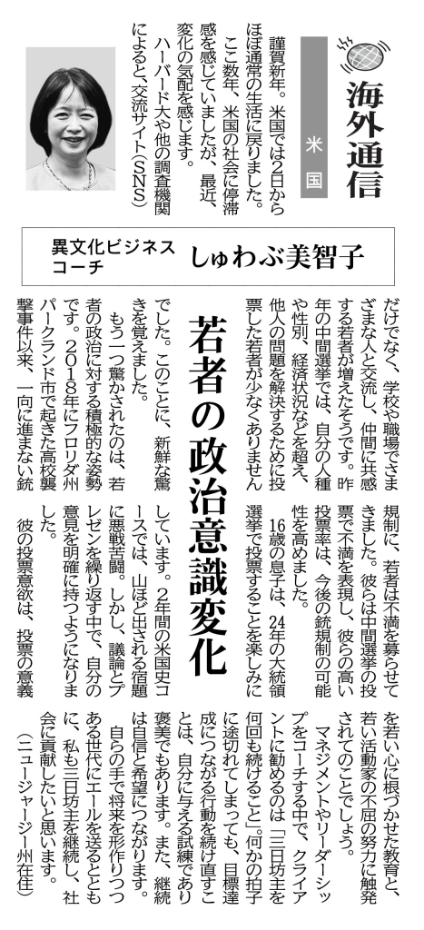 ハーバード大や他の調査機関によると、交流サイト(SNS)だけでなく、学校や職場でさまざまな人と交流し、仲間に共感する若者が増えたそうです。昨年の中間選挙では、自分の人種や性別、経済状況などを超え、他人の問題を解決するために投票した若者が少なくありませんでした。このことに、新鮮な驚きを覚えました。