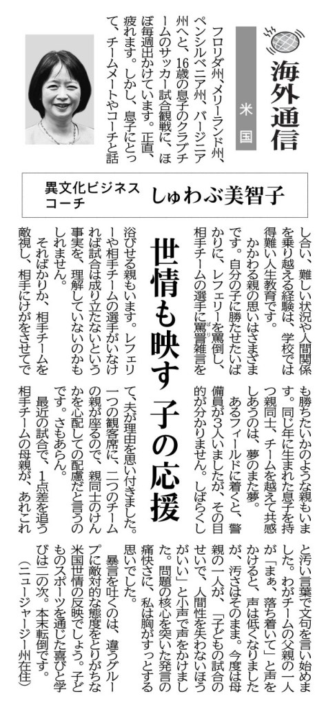 暴言を吐くのは、違うグループに敵対的な態度をとりがちな米国世情の反映でしょう。子どものスポーツを通じた喜びと学びは二の次。本末転倒です。