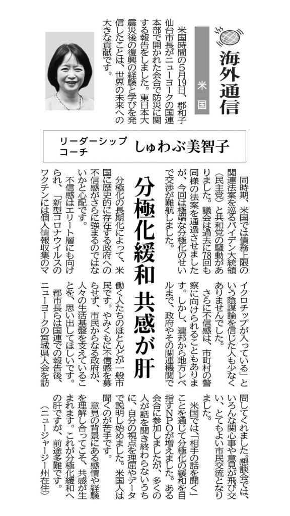 米国時間の5月19日、郡和子仙台市長がニューヨークの国連本部で開かれた会合で防災に関する報告をしました。東日本大震災後の復興の経験と学びを発信したことは、世界の未来への大きな貢献です。