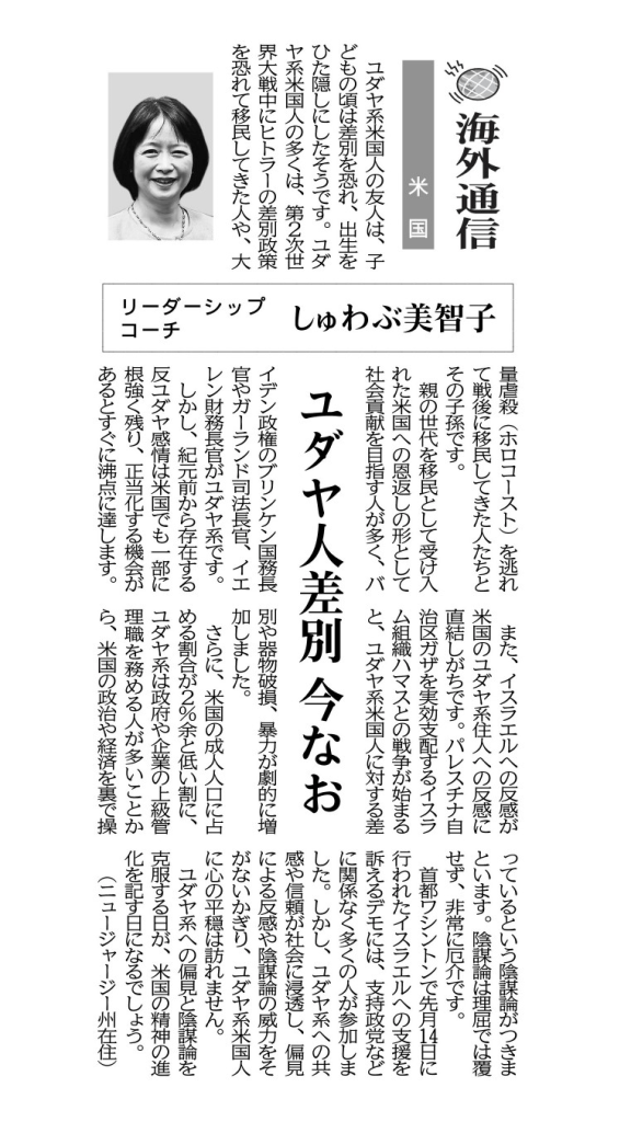 さらに、米国の成人人口に占める割合が2%余と低い割に、ユダヤ系は政府や企業の上級管理職を務める人が多いことから、米国の政治や経済を裏で操っているという陰謀論がつきまといます。陰謀論は理屈では覆せず、非常に厄介です。