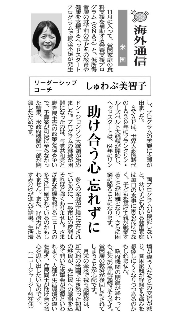 月末の全米で祝う感謝祭は、新天地の米国で生き残った初期の移民が、先住民への感謝を込めて開いた食事会が起源といわれます。人種や生活環境の違いを越え、住民同士が助け合う初心を思い出したいものです。