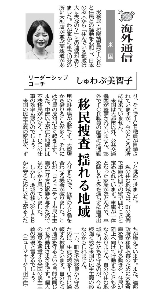 米移民・税関捜査局(ICE)と住民との騒動を心配し、日本の友人から「住んでいる地域は大丈夫なの?」と連絡がありました。わが家から車で10分のところに大型店が並ぶ高速道があり、そこでICE職員が目撃されていますが、今のところ近所には来ていません。